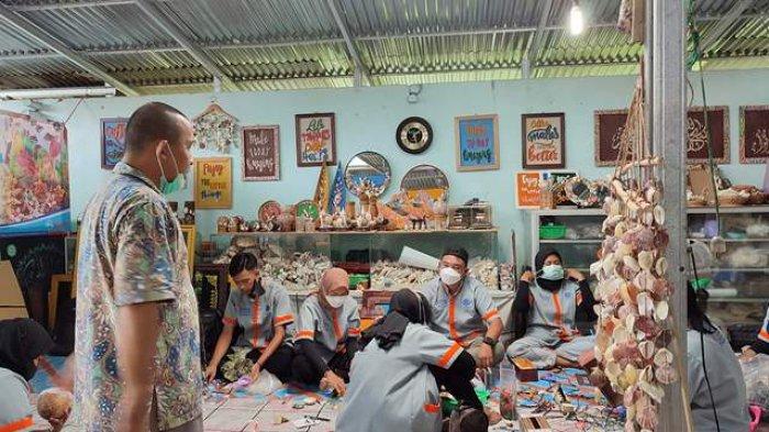 Pria yang juga pengrajin olahan kerang dan limbah ini tampak membimbing peserta pelatihan, sembari menilai buatan tangan peserta.