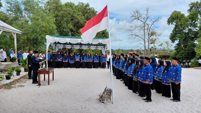 GANTUNG, BABEL NEWS - Bupati Belitung Timur, Kamarudin Muten memimpin prosesi pelantikan 22 kepala sekolah di kawasan Replika Gedung Laskar Pelangi di Kecamatan Gantung, Rabu (1/10). Para kepala sekolah yang hadir mengenakan seragam Korpri tampak berbaris rapi dan mengikuti rangkaian acara dengan penuh kesungguhan.